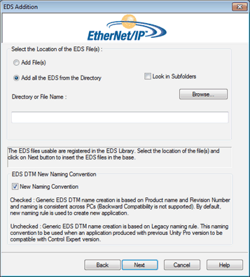 NOTE: To keep backward compatibility with Unity Pro/Control Expert versions, unchecked the New Naming Convention check box and the naming rule is based on Model Name / Product Name. |