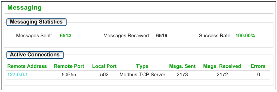 This field contains the total number of sent and received messages on port 502. These values are not reset when the port 502 connection is closed. Therefore, the values indicate the number of messages that have been sent or received since the module was started.