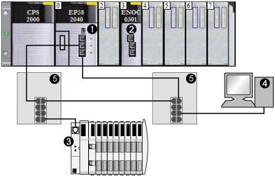 NOTE: Control Expert software running in the PC is used to configure the M580 CPU. In this example, the PC is indirectly wired to the CPU’s Ethernet port via the Ethernet switch. Alternatively, you could bypass the switch and directly wire the PC to the CPU’s Modbus ports.