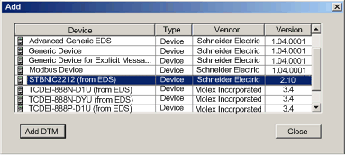 Click the Add DTM button to see the association between the Ethernet communication module and the STB NIC 2212 in the DTM Browser.