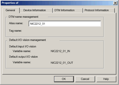On the General tab, create a unique Alias name. (Using similar devices that use the same DTM can result in duplicate module names.) In this example, type in the name NIC2212_01: