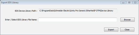 Right-click on the communication module and scroll to Device menu → Additional functions → Export EDS library to open the Export EDS library window: