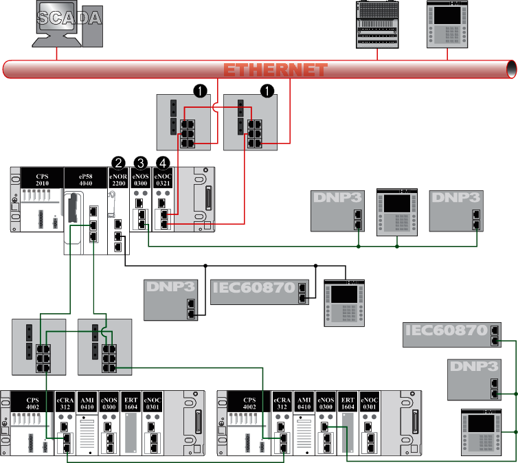 switch module connects the local rack to distributed equipment (RTU devices) using redundant links.