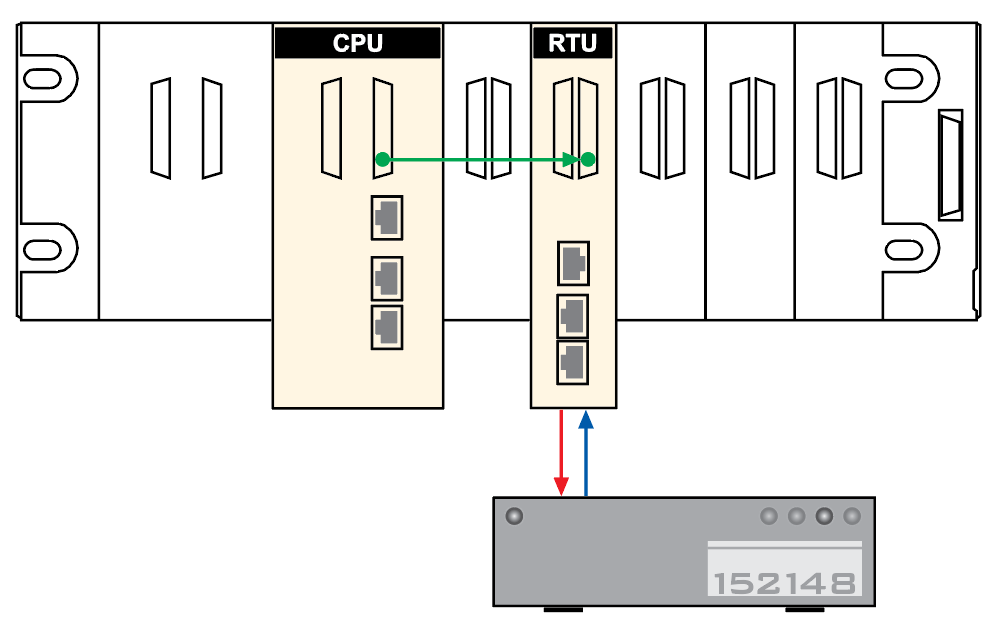 green line: The BMENOR2200H module sends the source clock synchronization signal to the controller over X Bus.