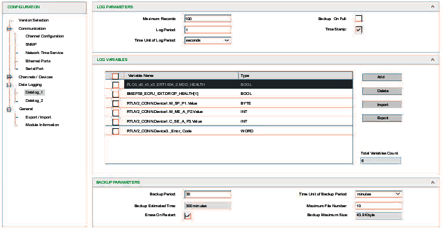 When a new backup event occurs (owing to a trigger or period expiration), a new record that contains all of the variable values is added to the log table (with optional time stamping). When the user-configured maximum number of records is reached, the newest records overwrite the oldest.