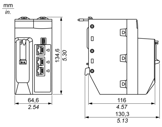 This graphic shows the front and side dimensions of the M580 standalone controllers: