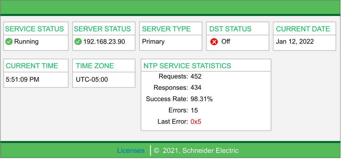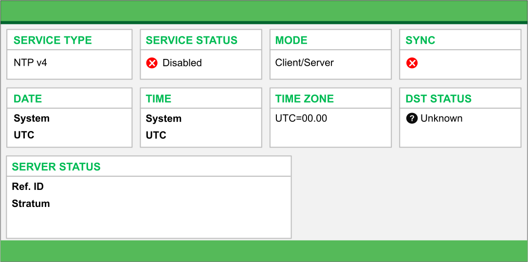 The page displays information about the network time service. There are three versions of this page, depending on the CPU firmware version and NTP mode: