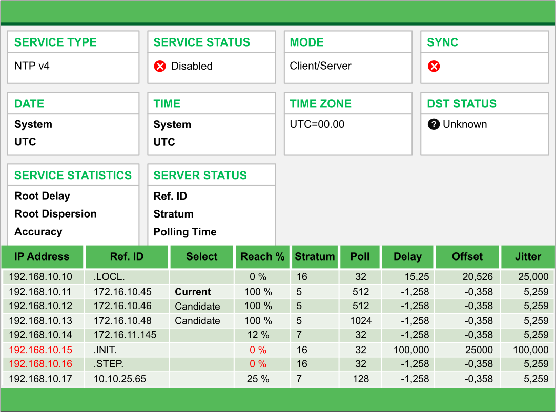 Indicates the peer used as the time source (Current) and other viable peer time sources (Candidate). |