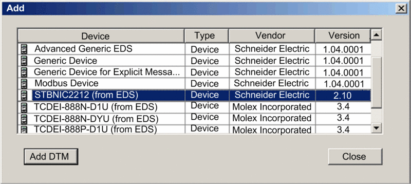 You can use the Control Expert device library to add a remote device—in this example the STB NIC 2212 module—to your project. Only a remote device that is part of your Control Expert device library can be added to your project.