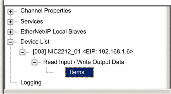 The final task in this example is to add I/O items to the configuration of the STB NIC 2212 and its eitht I/O modules: