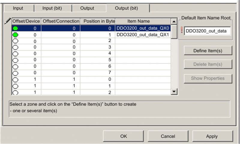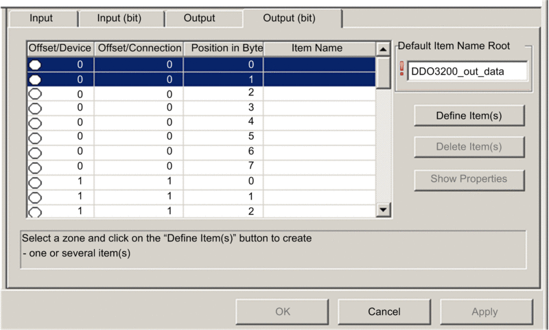 In the Items List, select the rows that correspond to bits 0-1 in byte 0—i.e., the first 2 rows: ![]() |