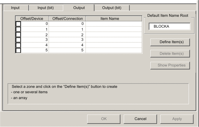 The Control Expert provides great flexibility in creating input and output items. You can create input and output items in groups of 1 or more single bits, 8-bit bytes, 16-bit words, 32-bit dwords, or 32-bit IEEE floating values. The number of items you create depends upon the data type and size of each item.