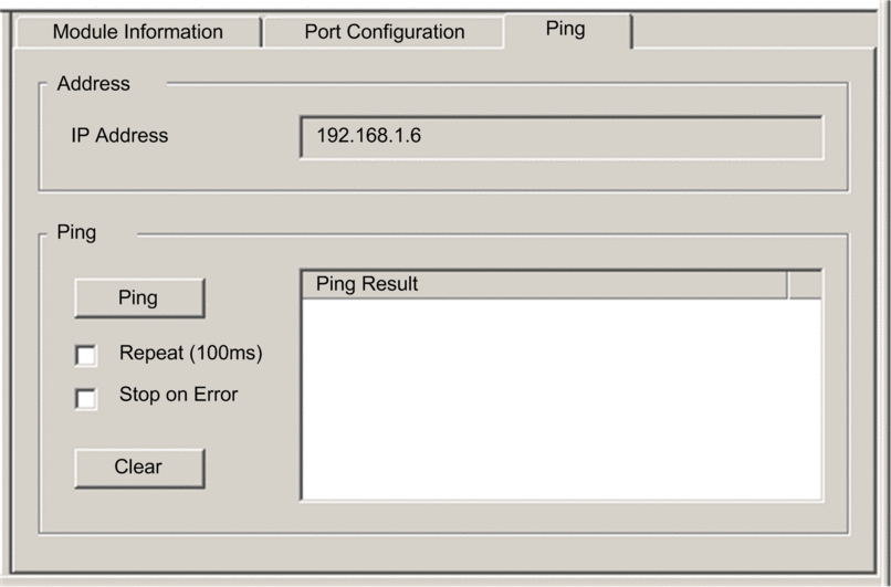 The box displays the ping outcome. Click to empty the box. |