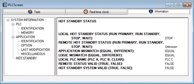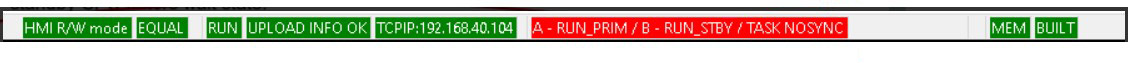 An additional status information is displayed when at least one task (MAST, FAST, or SAFE) is not synchronized between the Primary and the Standby controllers: TASK NOSYNC (red background):