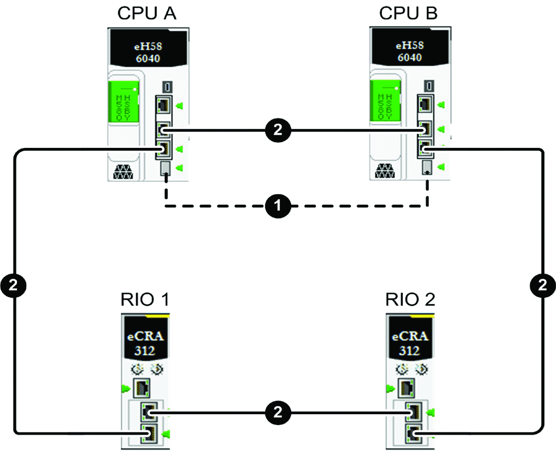 Ethernet RIO connections between each controller and one or more (e)X80 EIO adapter modules over the RIO main ring