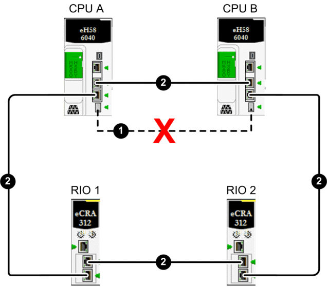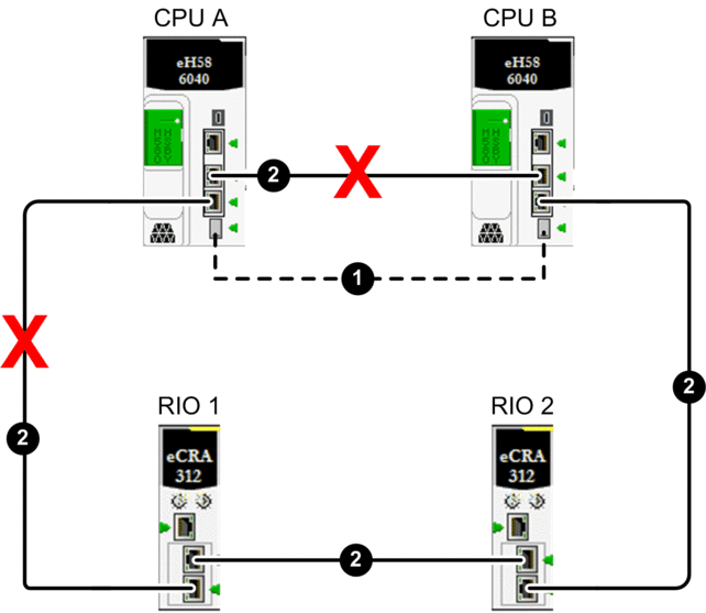 In this example, a single break exists in the Ethernet RIO main ring. Although the break occurs in the segment between the two controllers, in this example, the break could be located at any point along the Ethernet RIO main ring (2). All other Hot Standby system connections are functioning: