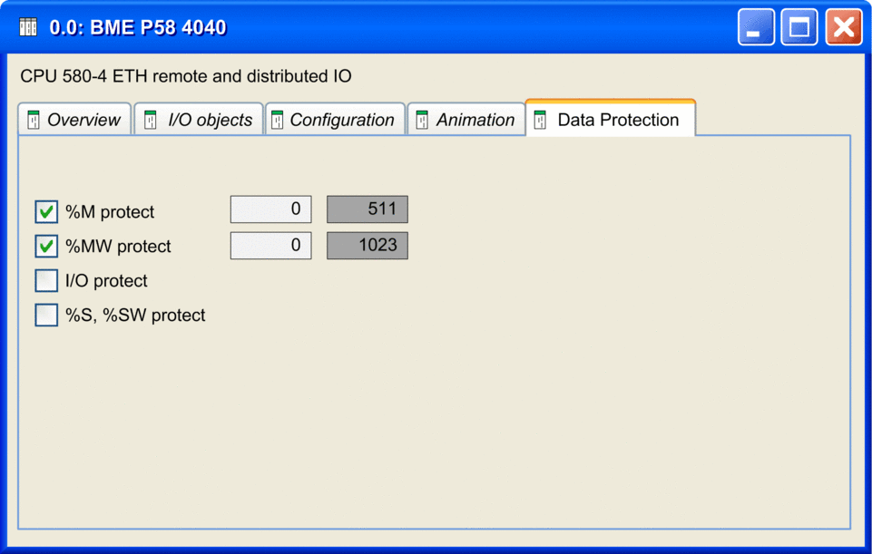 The data memory protection feature is supported by M580 CPU with the firmware V3.20 or any subsequent supporting version(s). For details, refer to the chapter Data Memory Protection.