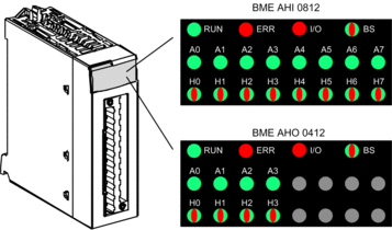 The BMEAHI0812(H) and BMEAHO0412(C) HART eX80 analog I/O modules include LEDs that indicate the operating status of the module: