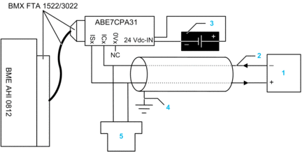 These examples illustrate how to connect the input module to a 2-wire or 4-wire transmitter using a TELEFAST wiring accessory and cable. The cable includes a 20-pin terminal block. 24 Vdc power is supplied to the 4-20 mA current loop: