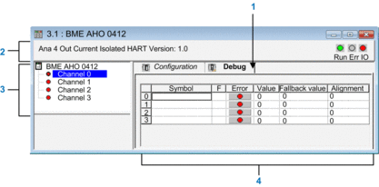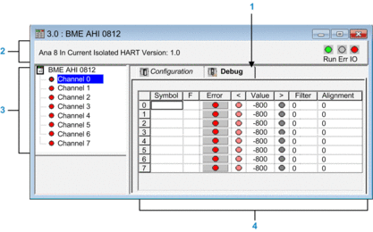 Displays the value and status for each channel in the module in real time. The symbol column displays the symbol associated with the channel when it has been defined this (from the variable editor). This area provides direct access to channel by channel diagnostics when these are inoperative (indicated by error column LED, which turns red).