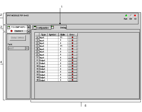 The debug screen displays the value and state of each of the selected module's channels in real time. It is also used to access the channel commands (forcing of the input/output value, SET and RESET).