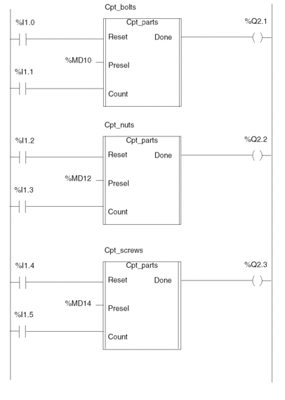 The number of parts to be procured for each type is defined in the words %MD10, %MD12 and %MD14 respectively. When the number of parts is reached, the counter sends a command to an output (%Q1.2.1, %Q1.2.2 or %Q1.2.3) which then stops the procurement system for the corresponding parts.