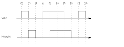 The rising edges of the value bit (1, 4) are copied to the history bit in the next PLC cycle (2, 5). The falling edges of the value bit (2, 7) are copied to the history bit of the next PLC cycle (3, 8).