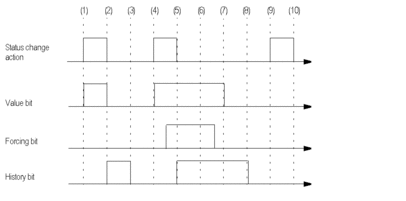 The rising edges of the value bit (1, 4) are copied to the history bit in the next PLC cycle (2, 5). The falling edges of the value bit (2, 7) are copied to the history bit in the next PLC cycle (3, 8). Between (4 and 5), the forcing bit equals 1 while the value and history bits remain at 1.