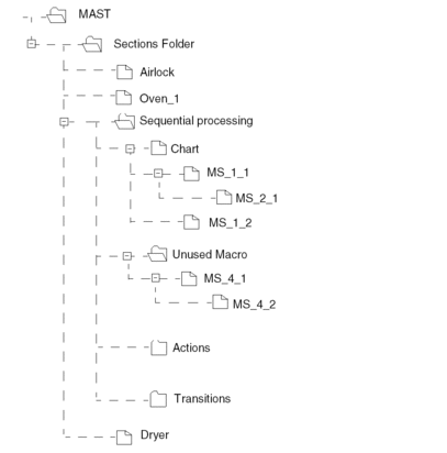 The following diagram gives an example of the structure of an SFC section, and uses the chart to show the macro step calls that are used.