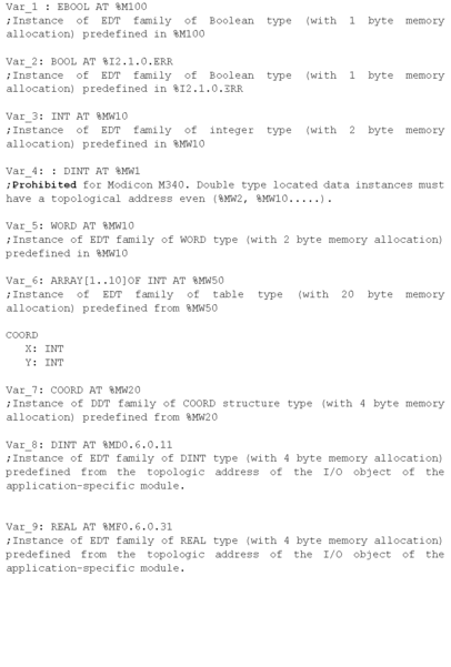 The list below shows the datas instances that should be located on a %MW, %KW addresses type: