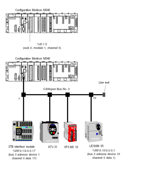 Examples: local station and station on bus for Modicon M340 PLCs.