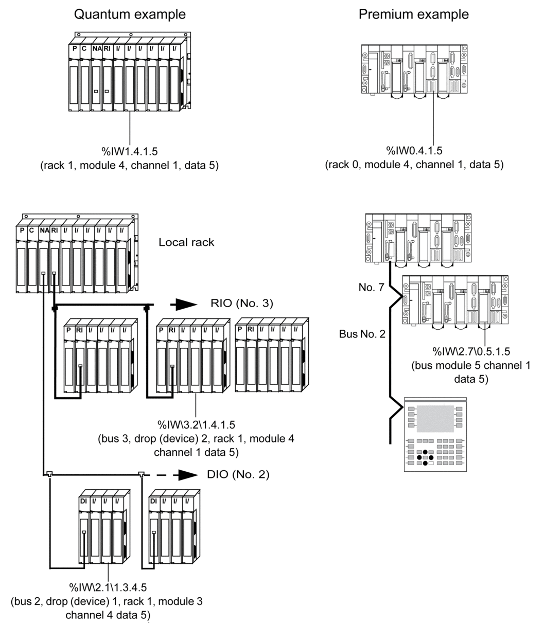 Examples: local station and station on bus for Quantum and Premium PLCs.