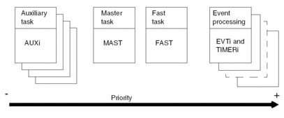 Event processing can be activated asynchronously with respect to periodic tasks by an order generated by external events. It is processed as a priority and requires any processing in progress to be stopped.