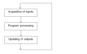 PLC in RUN, the processor carries out internal processing, input acquisition, processing of the application program and the updating of outputs in that order.