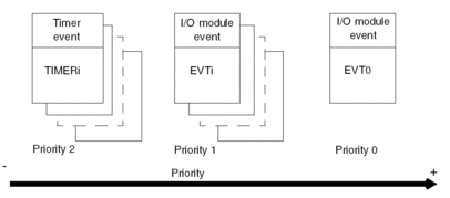 EVTi event processing triggered by input/output modules (priority 1) take priority over TIMERi event processing triggered by timers (priority 2).