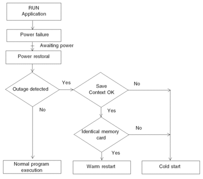 On power restoral, the saved context is compared to the current one, which defines the type of startup to be performed: