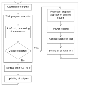 In the event of warm restart, if you want the application to be processed in a particular way, you must write the corresponding program conditional on the test that %S1 is set to 1 at the start of the master task program.