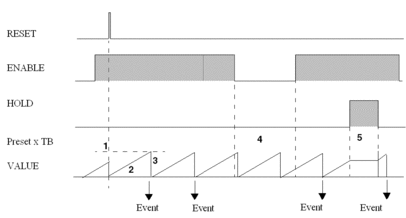This timer function periodically activates event processing every time the preset value is reached.