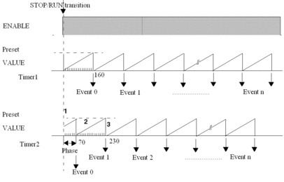 ON a STOP RUN transition of the PLC, timing is triggered so that the preset value is reached at the end of a time period equal to Phase x time base, when the first event is sent out. |