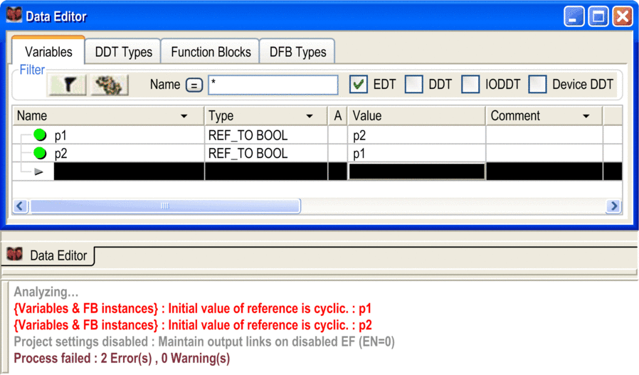 can only refer to variables of the given reference data type (EDT, DDT, or Device DDT) and can only be compared to a reference of the same or compatible type