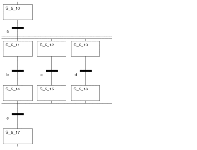 All parallel branches are grouped using a parallel joint according to IEC 61131-1. The transition following a parallel joint is evaluated when all the immediately preceding steps of the parallel joint have been set.