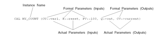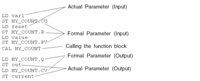 parameter names), the function block is called using a CAL instruction which follows the instance name of the function block