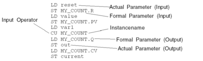 Function blocks can be called using an instruction list that consists of loading the actual parameters followed by saving them in the formal parameters followed by an input operator. The sequence of loading and saving the parameters is not significant.