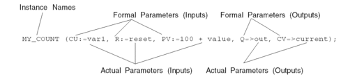 With formal calls (calls with formal parameter names), the function block is called using an instruction sequence made from the function blocks instance names followed a bracketed list of actual parameter assignments to the formal parameters. Assign input formal parameters using := operator, and for output formal parameters using the => operator. The sequence in which the input formal parameters and output formal parameters are enumerated is not significant.