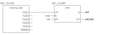 MY_CLOCK () ;MY_COUNT (CU:=MY_CLOCK.CLK1, R:=reset, PV:=100,