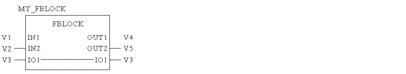 MY_FBLOCK(IN1:=V1, IN2:=V2, IO1:=V3, OUT1=>V4, OUT2=>V5); Calling the same function block in FBD: