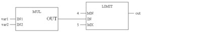 out:=LIMIT (MN:=4, IN:=MUL(IN1:=var1, IN2:=var2), MX:=5) ;Calling the same function in FBD: