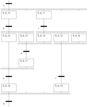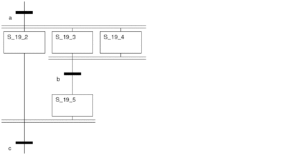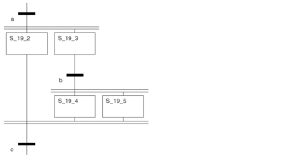 According to IEC 61131-3, a parallel branch must always be terminated with a parallel merge. The number of parallel branches must not coincide with the number of parallel merges however.