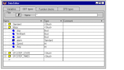 Data types and instances created using the data editor can be inserted (context dependent) in the programming editors.